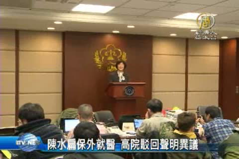 【新唐人亞太台2014年12月12日訊】繼續來看到最近備受關注的前總統陳水扁保外就醫案, 日前法務部長羅瑩雪明確指出有3種處理方法,包括向北院提出抗告、向高等法院聲明異議、以及擴大醫療鑑定小組等。陳水扁三管齊下,提出了抗告,也向高院提出聲明異議,不過高等法院在今天下午(12日)駁回了聲明異議,認為陳水扁應該直接打行政訴訟,至於抗告裁定則還沒有出爐 。