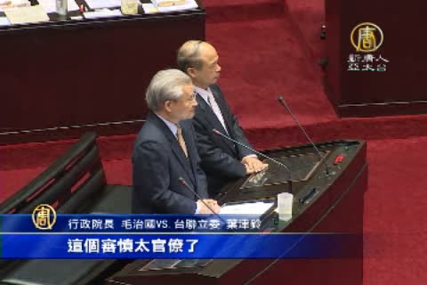 行政院長 毛治國VS.台聯立委葉津鈴:「101對台灣太重要」「我們會非常審慎處理好不好」「肯不肯把它否決掉?你一句話。」「我們會非常審慎處理,我們會審慎處理」「這個審慎太官僚了,應付應付的,可,不可,要不要否決,這樣子啊,很簡單!」「我們有一套行政程序要走,而且行政程序本身,我們也要尊重它,但是我相信在審查過程當中,社會大眾所關切的這些考量,他們也會適當納入。」
