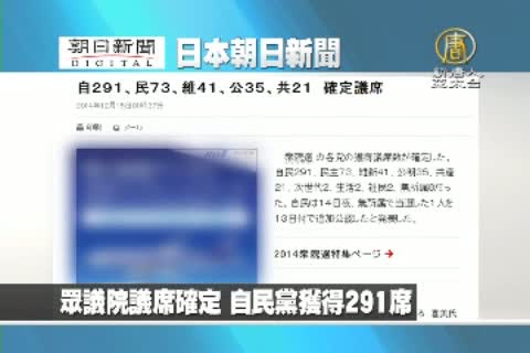 【新唐人亞太台2014年12月15日訊】來看到日本朝日新聞報導:眾議院議席確定,自民黨獲得291席,民主黨73席,維新黨41席,公民黨35席。