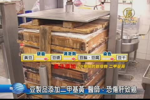 【新唐人亞太台2014年12月18日訊】國內豆干業者,遭檢出含「二甲基黃」,毒物科醫師就指出,該物質被列為2B等級的致癌物,長期食用不僅傷肝,還可能致癌。