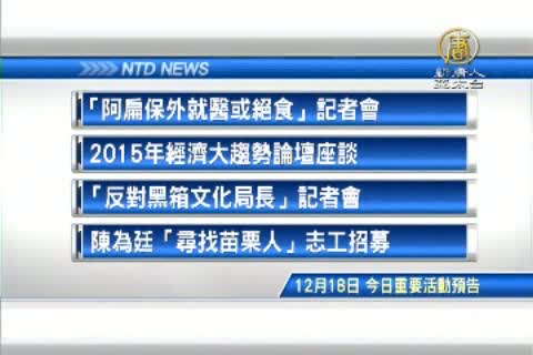 【新唐人亞太台2014年12月18日訊】接著看到,今天,十二月18日,星期四,有哪些重要活動,上午,前副總統呂秀蓮出席「阿扁保外就醫或絕食」記者會。柯文哲辦公室「反對黑箱文化局長」行動記者會。財經訊息有,「經濟投資展望論壇暨座談:2015年經濟大趨勢」,以及宣布參選苗栗立委的陳為廷,下午要說明他的「尋找苗栗人」志工計畫。