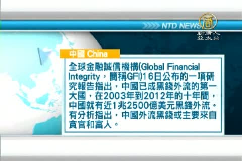 全球金融誠信機構(Global Financial Integrity,簡稱GFI)16日公布的一項研究報告指出,中國已成黑錢外流的第一大國,在2003年到2012年的十年間,中國就有近1兆2500億美元黑錢外流。有分析指出,中國外流黑錢或主要來自貪官和富人。