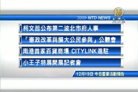 【新唐人亞太台2014年12月19日訊】接著看到,今天,十二月19日,星期五,有哪些重要活動,上 午,柯文哲第二波新人事公布。立法院召開「憲政改革與擴大公民參與」公聽會。辦公室「反對黑箱文化局長」行動記者會。財經消費訊息,南港第一家百貨商場CITYLINK正式開幕,以及下午在華山文創園區,有小王子特展的開展記者會。
