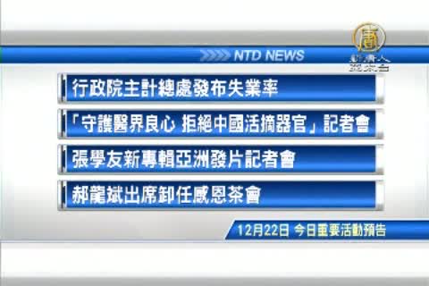【新唐人亞太台2014年12月22日訊】接著看到,今天,十二月22日,星期一,有哪些重要活動,主計總處上午發布國內最新失業率報告。下午有,人權團體及醫界代表舉辦「守護醫界良心 拒絕中國活摘器官」記者會。娛樂消息,張學友新專輯亞洲發片記者會,以及,台北市長郝龍斌,將出席卸任感恩茶會。