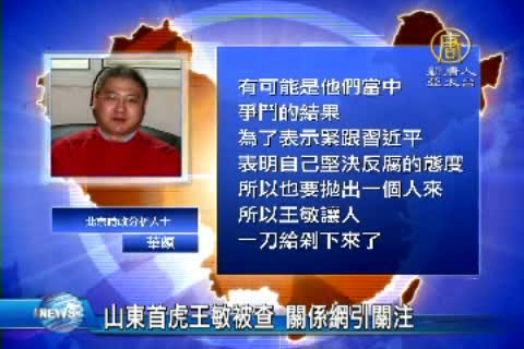 【新唐人亞太台2014年12月23日訊】中共山東省 省委常委、濟南市委書記王敏,日前因涉嫌嚴重違紀違法被調查,成為山東省第一位落馬的省部級官員。這位「山東首虎」王敏的落馬,讓和他仕途有密切關係的高官們,也受到外界關注。