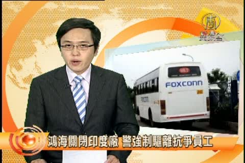 【新唐人亞太台2014年12月24日訊】鴻海集團日前宣布,關閉富智康印度清奈廠,引發當地員工連續多日抗爭。昨天一度有超過5百人企圖強行進入工廠大門,遭警方逮捕,今天,員工被短暫拘留後獲釋,但工會揚言要繼續抗爭。