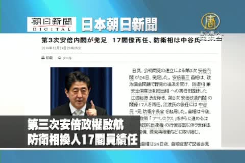 【新唐人亞太台2014年12月25日訊】來看到日本朝日新聞報導:第三次安倍政權啟航 防衛相換人17閣員續任。安倍強調,讓安倍經濟學成功是最大的課題。