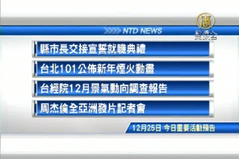 【新唐人亞太台2014年12月25日訊】接著看到,今天,十二月25日,星期四,有哪些重要活動,上午有,全台縣市長交接宣誓就職。台北101公佈新年煙火動畫記者會。財經消息,台經院公布12月景氣動向調查報告。以及娛樂消息,周杰倫,下午將舉行全亞洲發片記者會。