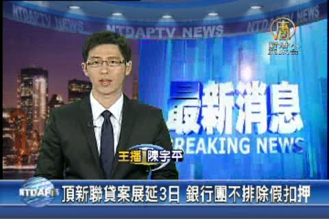 【新唐人亞太台2014年12月27日訊】新聞頭條,帶您看到,頂新集團旗下的三重新燕土地開發聯貸案,原本在今天下午四點到期,不過,稍早,承貸銀行團決議,允許展延三日,如果,頂新到期仍沒有清償,不排除假扣押土地和存款。稍後我們還有更完整的報導。