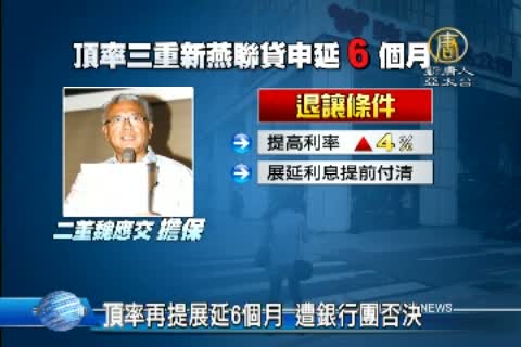 【新唐人亞太台2014年12月29日訊】而有關頂新旗下頂率開發,三重新燕土地聯貸案 65億元的借款爭議,上午 頂率方面表示,已收到存證信函,希望跟銀行團協商,爭取展延六個月,不過據說,已經遭到銀行團否決。