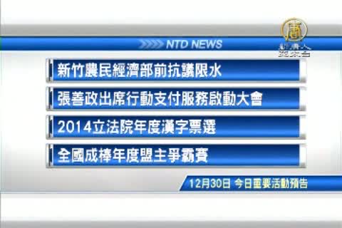【新唐人亞太台2014年12月30日訊】接著看到,今天,十二月30日,星期二,有哪些重要活動,新竹農民北上到經濟部抗議限水,2014立法院年度漢字票選,行政院副院長張善政將出席行動支付服務啟動大會,另外,還有一場全國成棒年度盟主爭霸賽。