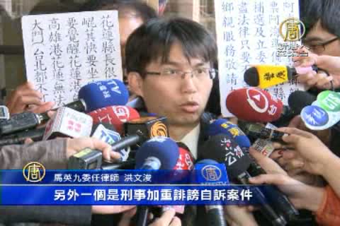 馬英九委任律師 洪文浚:「今天我們來提的主要是兩個部分訴訟,一個是民事妨害名譽損害賠償訴訟,另外一個是刑事加重誹謗自訴案件。求償金額我們今天提出的訴狀是一千萬元,另外還有登四大報,對這件事情要跟總統做公開道歉。」