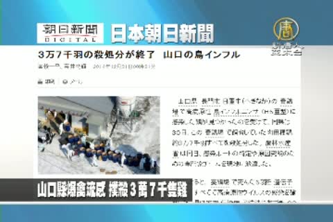 【新唐人亞太台2014年12月31日訊】來看到日本朝日新聞報導:山口縣爆禽流感 撲殺3萬7千隻雞。山口縣一養雞場內的雞,確定感染H5禽流感, 目前已經撲殺了3萬7000隻雞。 專家已前往當地調查感染途徑。
