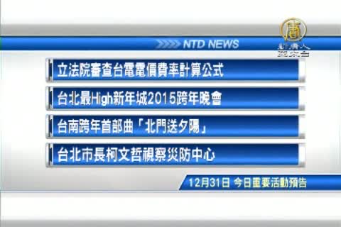 【新唐人亞太台2014年12月31日訊】接著看到,今天,十二月31日,星期三,有哪些重要活動,早上,立法院經委會將審查台電電價費率計算公式。全台今晚六點半起,包括台北在內,各地有多個大型跨年晚會,而台南在下午五點要舉辦,「北門送夕陽」活動,另外,台北市長柯文哲將視察災防中心。