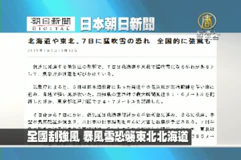 【新唐人亞太台2015年1月7日訊】來看到日本朝日新聞報導:全國刮強風 暴風雪恐襲東北北海道