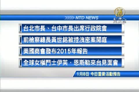 【新唐人亞太台2015年1月8日訊】接著來看到,今天,一月八日,星期四,有哪些重要的活動,上午,台北市長柯文哲、台中市林佳龍長出席行政院院會。前檢察總長黃世銘被控洩密案,今天上午開庭。美國商會發布2015年報告。以及,全球女權鬥士伊芙.恩斯勒 今天舉辦來台見面會。