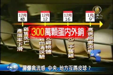 【新唐人亞太台2015年1月10日訊】鏡頭轉回台灣,來關心H5N2禽流感疫情。爆發高病原禽流感的屏東養雞場,今天持續撲殺雞隻,這座養雞場號稱是蛋雞界的模範生,但在上個月中就出現4天死2千隻雞的異常狀況,卻一直到9日才確定是得到禽流感。這中間將近一個月的空窗期,至少有300萬顆問題雞蛋已經流入市面。