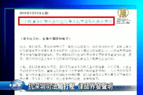 【新唐人亞太台2015年1月14日訊】中國維權律師的處境備受關注,日前,有上百名大陸律師發表聯合聲明,要求深圳市司法局和其下屬相關司法局,立即停止對深圳律師範標文、王勝生等人的迫害,同時希望中華全國律師協會能夠及時地維護他們的合法權益。今天晚間,我們還會有更完整的報導。