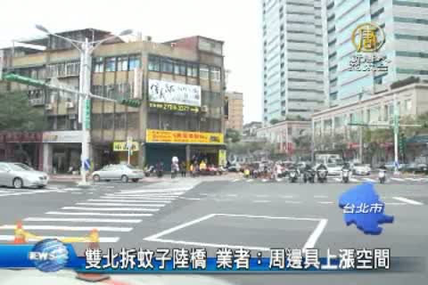 【新唐人亞太台2015年1月17日訊】在台北市許多交叉路段街頭,都可看到的陸橋因為使用率低,不僅有礙市容,也影響周邊店家生意往來,今年月初台北市政府就火速7小時內,拆除昆陽陸橋,據雙 北市工務局統計,台北市全市目前約有88座陸橋,新北約143座,房仲業者預估,拆除後,周邊不動產物件尤其一樓店面,將有漲幅空間,粗估約一成以上。