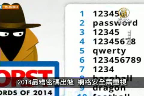 美國信息技術網站SplashData最近從在網絡上遭到洩漏的3.3萬個密碼中,評出了2014年最糟糕的25個密碼,前三名分別是「123456」、 「password」和「12345」。這個名單與2013年雷同,說明很多人仍然對網絡安全和保護隱私缺乏重視。