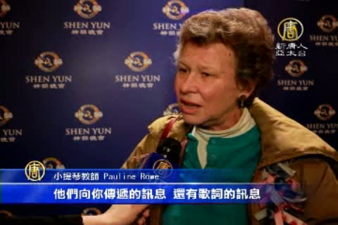 小提琴教師Pauline Rowe:「演出讓我激動得無法形容、感動落淚,真是力量強大。演出非常之美。藝術表現簡直不可思議,服裝、創意、編舞,對我影響最大最深的是其精神內涵。能體會到中國人心靈的感受。」