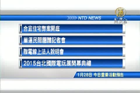【新唐人亞太台2015年1月28日訊】接著看到,今天,一月28日,星期三,有哪些重要活動,上午,合宜住宅弊案開庭,另外,巢運民間團體今天會在財政部前舉辦記者會,抗議高房價,財經方面,聯電舉辦線上法人說明會,以及,2015台北國際電玩展開幕。