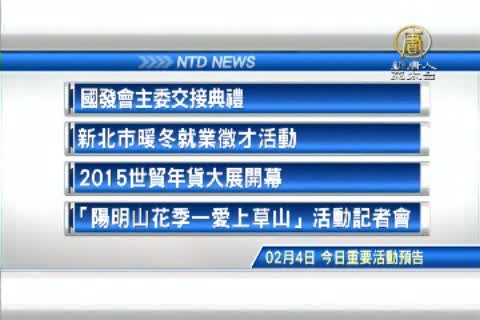 【新唐人亞太台2015年2月4日訊】接著看到,今天,二月4日,星期三,有哪些重要活動,國發會主委交接典禮。新北市暖冬就業徵才活動。2015世貿年貨大展開幕,以及,這個週末就要登場的「陽明山花季—愛上草山」活動記者會。