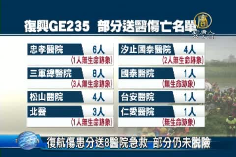 GE235班機意外失事,機上58名乘客,已知傷者分別送往,包括台北忠孝醫院、三軍總醫院、松山醫院、汐止國泰醫院等,進行急救,其中4男5女共9人到院前已無生命跡象,部分傷者仍需進行觀察照護。其中忠孝院區,一歲林姓男童因酸中毒,仍在加護病房觀察,而另有一位大陸遊客黃先生,則多處骨折,仍待觀察,好在意識清楚。