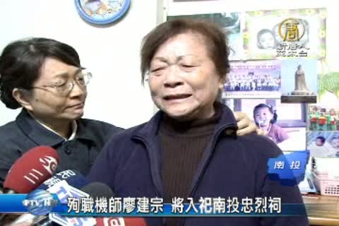 【新唐人亞太台2015年2月6日訊】殉職機師廖建宗、劉自忠與洪炳衷,英勇迫降決定,被認為是救了台北;南投縣長林明溱已決定,要讓老家在南投的廖建宗,入祀忠烈祠。
