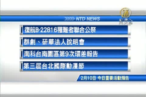 【新唐人亞太台2015年2月10日訊】接著看到,今天,二月10日,星期二,有哪些重要活動,首先是,復航B-22816罹難者聯合公祭,總統馬英九將會出席,財經消息,群創、研華將舉行法人說明會,另外,環保署今天要審查「南科台南園區第9次環差報告」,最後來看到,為期六天的第三屆台北國際動漫節,也在今天開幕。