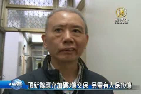 【新唐人亞太台2015年2月11日訊】前頂新製油集團董事長魏應充,昨天獲彰化地院裁准3億元交保返家,今天一早再度到台北地院出庭。法官發現魏應充有新加坡居留權,並且全案還有共犯在逃,認為魏應充有逃亡之虞,最後裁定,魏應充加碼3億交保,另外需要有人保10億,隨即將他帶到候審室等候交保。若傍晚 5點前,交保條件不齊備,將召開羈押庭。