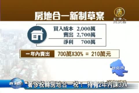 【新唐人亞太台2015年2月12日訊】財政部今天端出最新出爐的房地合一稅制,預定105年元旦起實施,對自用住宅者最重要的是,在房屋住滿6年,出售總額不到4000萬元,享有免稅,但6年內以1次為限,稅率的部分,原則採單一稅率17%淨利課稅,但兩年持有就出售,則課較高的30%。