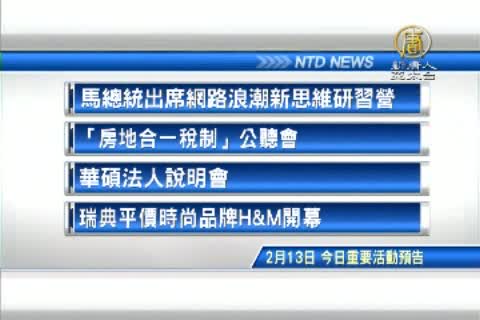 【新唐人亞太台2015年2月13日訊】接著看到,今天,二月13日,星期五,有哪些重要活動,總統馬英九與副總統吳敦義出席網路浪潮新思維研習營,立院舉辦「房地合一稅制」公聽會,財經消費,華碩、遠傳今天將舉辦法人說明會,瑞典平價時尚品牌H&M台灣旗艦店開幕,外界看好將有平價服飾大戰。