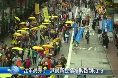 【新唐人亞太台2015年2月14日訊】接下來看到,2月初香港最新民情指數,創下20年來的新低,大幅下跌了8.3點至63.點。 民研計劃解釋,民情指數下跌,主要是因為反映香港市民對政府管治的評價,以及對社會狀況評價的「政評指數」以及「社評指數」,雙雙下跌,顯示施政報告對紓緩民怨的作用,似乎是已經減退,而近期有關中港矛盾事件陸續出現,相信也對民情指數,有一定的影響。