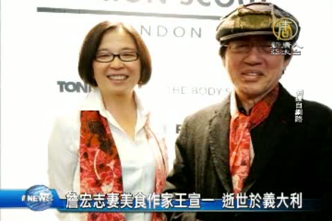 【新唐人亞太台2015年2月16日訊】台灣知名美食作家王宣一,今天不幸在義大利猝逝。她的先生、PC Home創辦人詹宏志忍住哀傷,在駐義大利代表處和旅義台灣人的協助下,處理後續事宜。有媒體引述詹宏志的話表示,他們原本打算利用這趟旅程品嚐歐洲的美食,但太太可能是心臟病發,享年59歲;消息一傳出,讓文化界人士與讀者震驚、惋惜不已。美食作家王宣一熱情好客,去年還為了力挺好友馮光遠參選台北市長,端出多道拿手好菜為馮光遠募款。