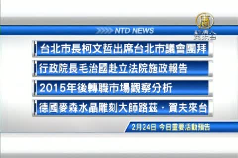 【新唐人亞太台2015年2月24日訊】接著看到,今天,二月24日,星期二,有哪些重要活動,台北市長柯文哲出席市議會團拜,行政院長毛治國赴立法院施政報告,財經消息,今天有一場2015年後轉職市場觀察分析,另外,德國麥森水晶雕刻大師 路茲.賀夫,也在今天來台。