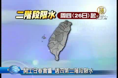 【新唐人亞太台2015年2月24日訊】年節剛過,開工日凌晨春雷乍響,北台灣一陣大雨,但很可惜及時雨沒下在水庫集水區,面臨十年來的大旱,經濟部宣佈週四開始,將在新北市、桃園、台中、高雄等地區展開第二階段限水,每月用水超過1000度的用水大戶,包括電子、紡織跟造紙業都將面臨衝擊。