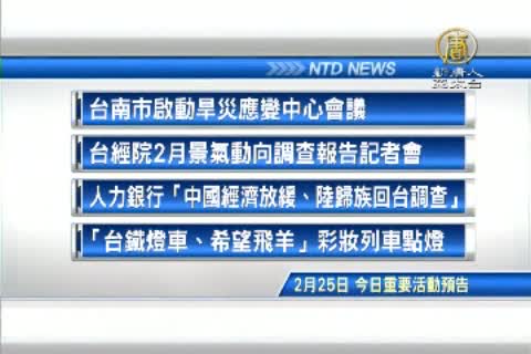 【新唐人亞太台2015年2月25日訊】接著看到,今天,二月25日,星期三,有哪些重要活動,上午,台南市長賴清德啟動旱災應變中心會議,財經消息,台經院舉辦景氣動向調查報告記者會,人力銀行舉辦一場,「中國經濟放緩、陸歸族回台調查」記者會,而在晚上呢,還會有一場台鐵首創燈車點燈活動。
