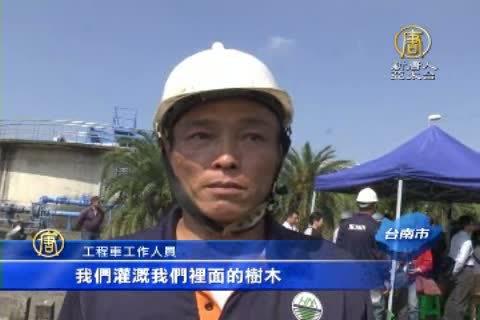 灑水車沿著街道灑水洗街,這些水都來自台南水資源回收中心,因應台灣10年來最嚴重的乾旱,台南市長賴清德特地到安平水資源回收中心進行訪視。