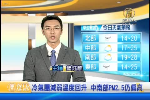 【新唐人亞太台 2015 年 03 月 05 日訊】歡迎您收看3月5日的早安新唐人,我是鐘鈺麒。先來帶您關心今天的天氣情況。今天白天起,大陸冷氣團減弱,溫度將回升而且降雨逐漸稍緩,中南部的溫差比較大。 北部、宜蘭、花蓮地區,高溫約在19度21度之間,中南部及台東,高溫大約在25度到28度,至於空氣品質,今天中南部地區受擴散條件不佳的影響,PM2.5指標為中至高等級,提醒外出朋友最好還是戴上口罩。帶您一起來看到國際媒體重要訊息。