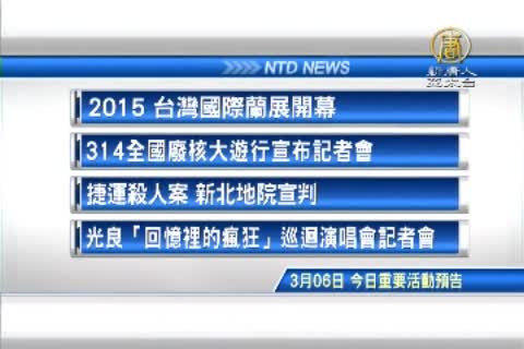 2015 台灣國際蘭展開幕;告別核電 能源新願」314全國廢核大遊行,捷運殺人案,凶嫌鄭捷被求處死刑,新北地院下午宣判 。以及,歌手光良「回憶裡的瘋狂」,巡迴演唱會記者會。