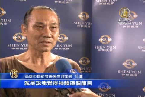 高雄巿民宿發展協會理事長 任潭:「尤其剛開始很多那個神佛從上面下來,一般人以為那是神佛才做到的,那我是覺得我們人本身就來自天上的啦,所以我很感動,就是說這個神,尤其最後談到,歌唱的,高音的就說神沒有欺騙我們。我們現在也是準備自己在好好修行,等待我們回到天上去,那現在就是說,我為什麼每年都很期待這個神韻的節目,就是說我覺得神韻這個節目能夠為我們的生命教育,有些像有些倫理啊,有些愛的價值觀能夠提升,這是這是非常正面正面的啦。」