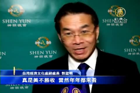 駐芝加哥台北經濟文化辦事處副處長 郭聖明:「我覺得神韻晚會讓我(有)一個很深刻的很感動的一個地方就是,不管是飛天藝術學院啦、或者是神韻舞團(藝術團)啦,那麼他們在中華這個舞蹈、音樂、那麼在這個文化涵養方面這個保存啦,還有這個傳遞呀,他們都扮演了一個很重要的角色和功能,那麼在海外,能夠傳揚下一個中華文化,特別讓我感覺到非常的佩服。」