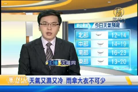 【新唐人亞太台 2015 年 03 月 11 日訊】歡迎您收看3月11日的早安新唐人,我是沈唯同。先來帶您關心今天的天氣情況。一大早出門就是濕濕冷冷的天氣,今天清晨北台灣空曠地區低溫可能只有10℃,都會地區11到12℃左右,東北部地區低溫11到13℃;中部低溫14到16℃,南部16到18℃。白天冷空氣持續影響,各地溫度仍偏低,另外受到華南雲系東移影響,除了天冷,下雨的情況還會持續,溫度也會更低,提醒大家今天上班上課一定要注意保暖,別忘了攜帶雨具出門,否則很容易感冒。帶您一起來看到國際媒體重要訊息。
