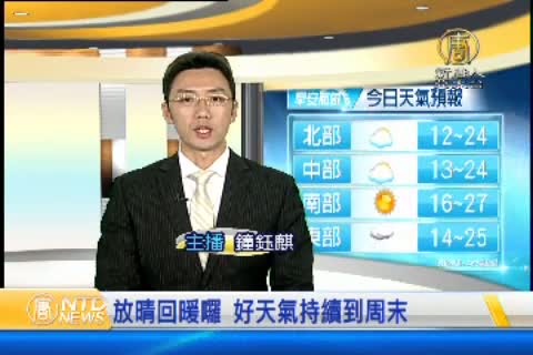【新唐人亞太台 2015 年 03 月 13 日訊】歡迎您收看3月13日的早安新唐人,我是鐘鈺麒。先來帶您關心今天的天氣情況。因為冷空氣減弱,氣溫回暖,好天氣可望持續到周末今天,白天各地溫度大幅回升,北台灣尤其明顯,高溫可回升到23到25℃,不過,夜晚到清晨仍稍偏涼,提醒您,要注意日夜溫差變化。帶您一起來看到國際媒體重要訊息。