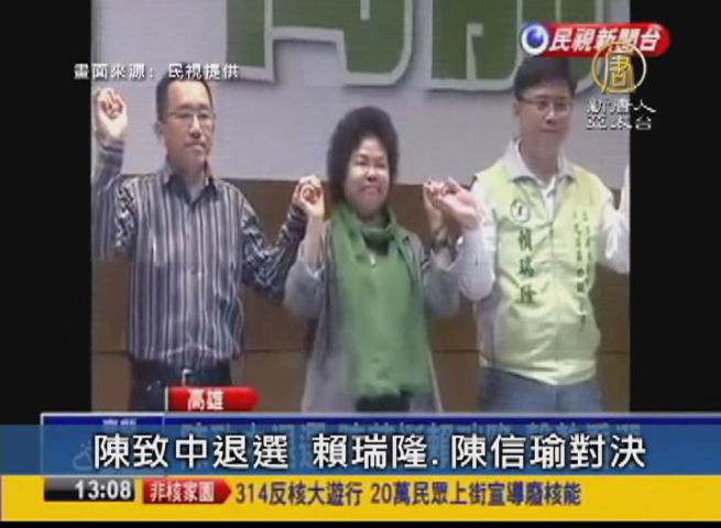 陳前總統的兒子陳致中昨天拋出震撼彈,宣布退出立委選舉,把機會讓給陳菊的子弟兵賴瑞隆。賴瑞隆有市長陳菊公開力挺,今天又有漁業界出面支持,聲勢看漲。不過現任議員陳信瑜仍然堅持參選到底,高雄前鎮小港區還是形成二搶一的局面。