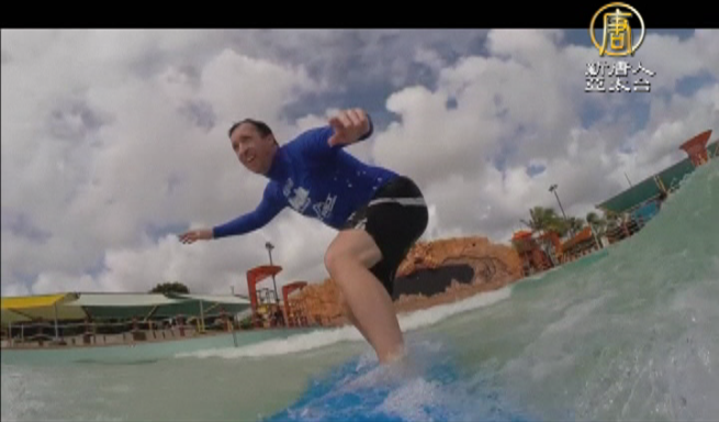 在摔過幾次跟頭之後,他終於可以站上衝浪板了!一旁的記者還不忘開他玩笑。