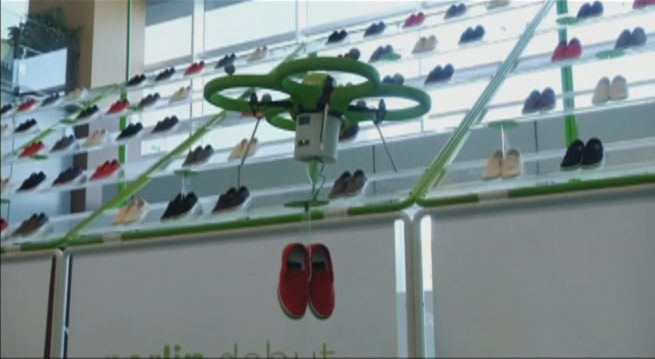 【新唐人亞太台 2015 年 03 月 22 日訊】在自動化商店內,消費者只要在平板電腦螢幕上選擇好想要的鞋,然後按下「起飛」按鈕,是的,真的是起飛按鈕,無人機就會帶著您想要的鞋子立即飛過來了這種新奇的概念叫做飛鞋購物[字幕:飛鞋購物]。果然讓消費者覺得這種購物體驗很吸引人。