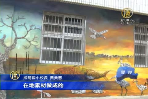 【新唐人亞太台 2015 年 03 月 25 日訊】在雲林金湖休閒農業發展協會的推動下,藝術家陳玄茂和協會的員工共同合作,幫口湖成龍國小的舊牆面增添新裝,讓全校小朋友都非常開心,黃美惠校長說,把成龍溼地國際藝術節的作品,呈現在學校裏面。