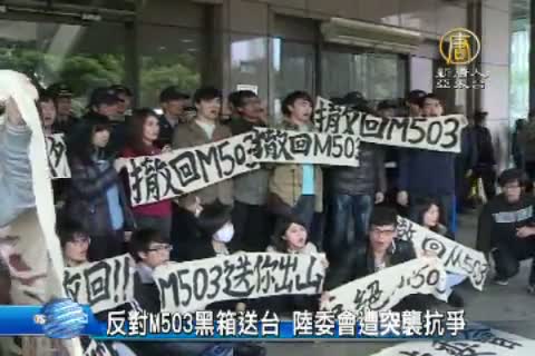【新唐人亞太台 2015 年 03 月 26 日訊】中共片面劃設M503航線,即將在29日啟用,引發台灣的國安與飛安擔憂,今天,黑色島國青年陣線等團體前往陸委會突襲抗議。